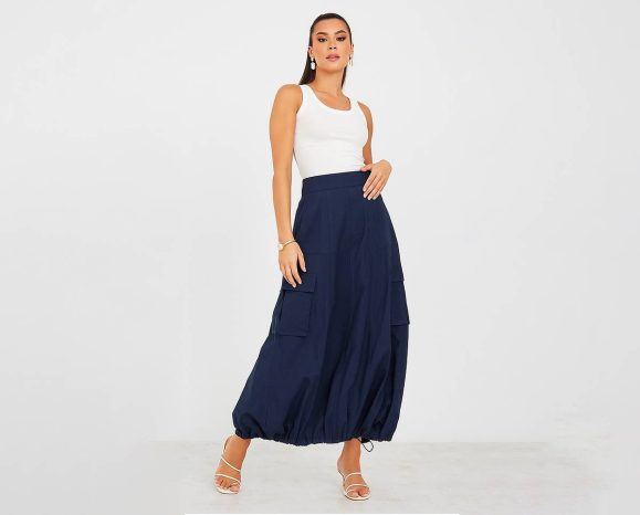 If you like a trend-forward style, pair your maxi cargo skirt with a fitted crop top. This creates a flattering contrast between the volume of the skirt and the fitted silhouette of the top.